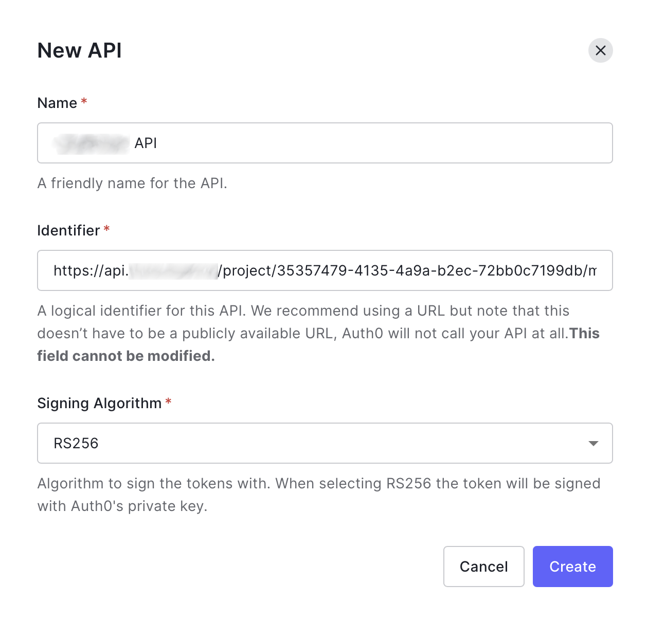 In Auth0, go to Applications > APIs then select Create API. On the next screen use the audience from the service configuration screen as the Identifier and be sure you use the default RS256 encryption algorithm.