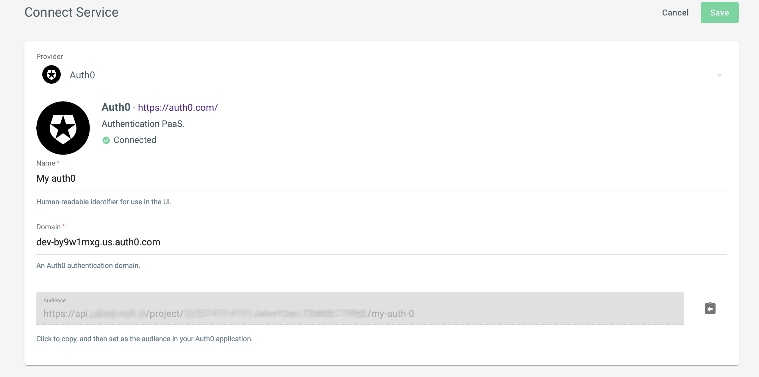 In your project, go to the Home tab and select Connect Service. Choose Auth0 as the service provider and then fill out the configuration screen, using the domain you copied from Auth0.